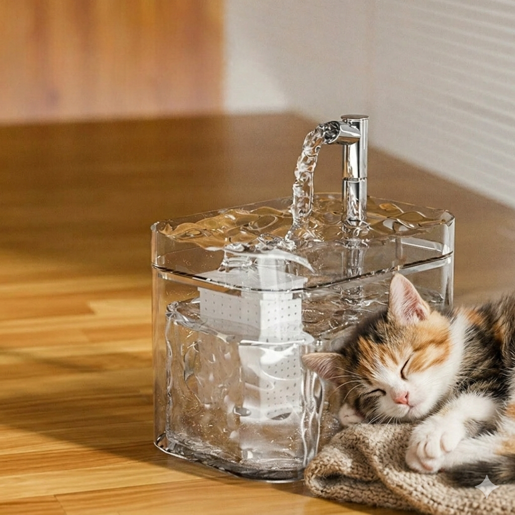 De ultra-stille motor verbruikt weinig stroom en maakt minder geluid dan een koelkast. Zet hem neer en vergeet hem — tot je ziet hoeveel meer je huisdier drinkt.