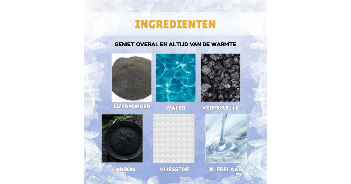 HeatWave Essentials gebruikt een mix van natuurlijke componenten zoals ijzerpoeder, actief kool en zout. Volledig geurloos en huidvriendelijk, zodat je ze de hele dag zonder zorgen kunt dragen.